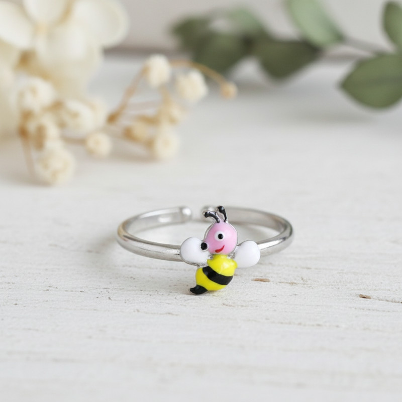 L'abeille, symbole de communauté et de merveilleux, est magnifiquement réalisée avec ses détails minutieux : sa tête rose vif et son corps jaune-or sont accentués par des rayures noires saisissantes qui rappellent l'apparence d'une véritable abeille. Des ailes blanches déployées confèrent une impression de mouvement et une dimension supplémentaire au design, rehaussant ainsi l'attrait général de la bague enfant.