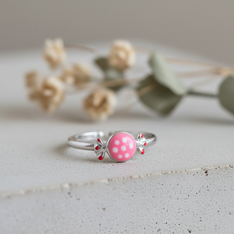 Le motif en bonbon émaillé est ce qui rend cette bague enfant vraiment spéciale. L'email rose vif parsemé de pois blancs attire immédiatement l'attention, tout en évoquant une friandise savoureuse. C'est un véritable petit plaisir visuel que votre enfant adorera montrer à ses amis. Chaque détail, des petits accents rouges aux contours du bonbon, a été pensé pour offrir un contraste ravissant et une apparence de haute qualité.