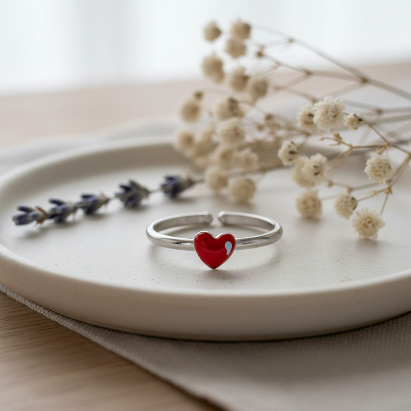 Notre bague utilise de l'argent massif 925/1000 qui garantit non seulement une excellente résistance à l'usure mais procure également une élégance irrésistible. Le cœur rouge, éclatant par nature, est l'élément central de notre bague. Fabriqué en émail, il attire instantanément le regard grâce à sa couleur vive et son insertion soigneuse, qui éveille des sentiments de passion et de créativité.