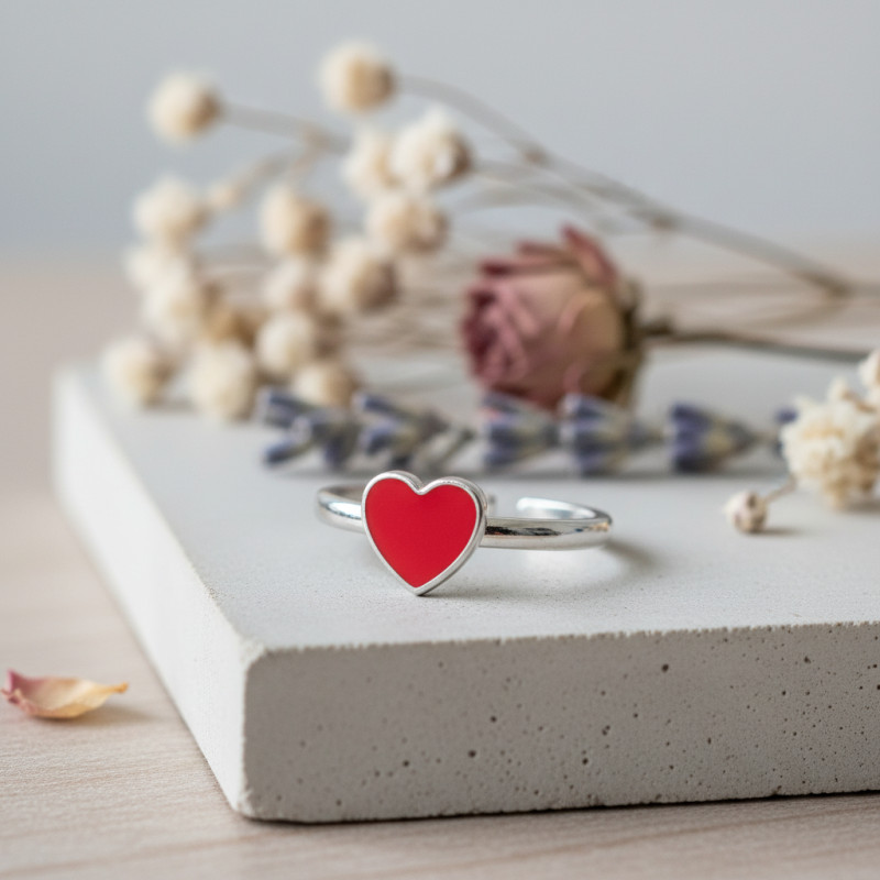 À cela s'ajoute un ornement en forme de cœur, finement laqué d'un rouge captivant. Ce cœur n'est pas seulement un symbole, mais également une pièce maîtresse qui attire l'œil et rehausse la bague de sa présence à la fois délicate et passionnée.