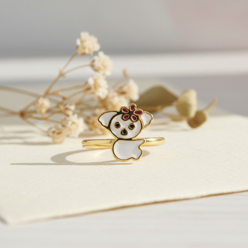 Découvrez la bague enfant Koala, une harmonie délicate de plaqué or et d'émail. Confectionnée avec un soin particulier en émail, elle se pare d'un plaqué or de 3 microns. La petite tête de koala, douce et malicieuse, captive par ses tonalités grises mêlées de couleurs vives. Avec un design ajustable, cette bague s'adapte à la main de votre enfant, pesant seulement 1,06 gramme.