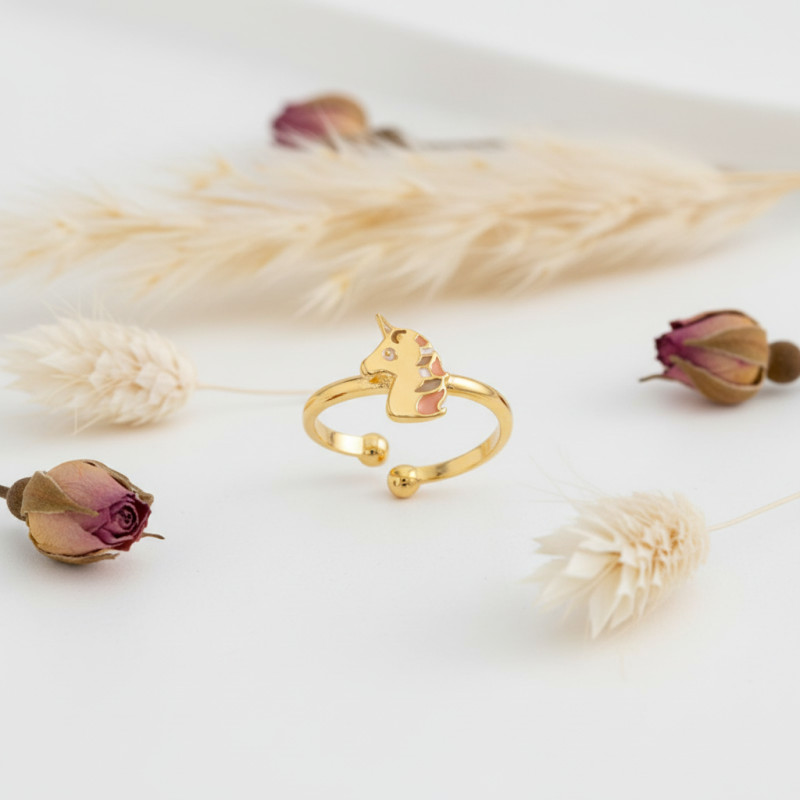 L'enchantement commence avec cette bague licorne pour enfants, où l'imagination et le style se rencontrent dans une harmonie parfaite. La licorne, un symbole éternel de pureté et de magie, est ici magnifiquement capturée en métal plaqué or. Ce bijou n'est pas seulement un accessoire, c'est une affirmation de goût élégant doublée d'un clin d'œil ludique au monde fantastique de l'enfance.