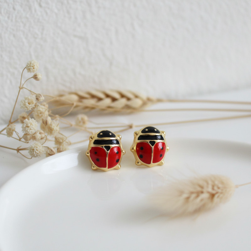 Nous vous proposons de succomber pour la beauté de cette élégante paire de boucles d'oreilles enfants. Elles prennent la forme de petites coccinelles qui raviront à coup sûr tous les petits passionnés d'animaux. Elles sont réalisées en émail rouge et noir ainsi qu'en or jaune. Les détails sur ces boucles d'oreilles tels que les 6 pattes en or sont le résultat d'un long travail à la main et la preuve d'excellente qualité. Concernant les dimensions de ces boucles d'oreilles enfants, elles sont les suivantes : 5 x 5,30 mm.