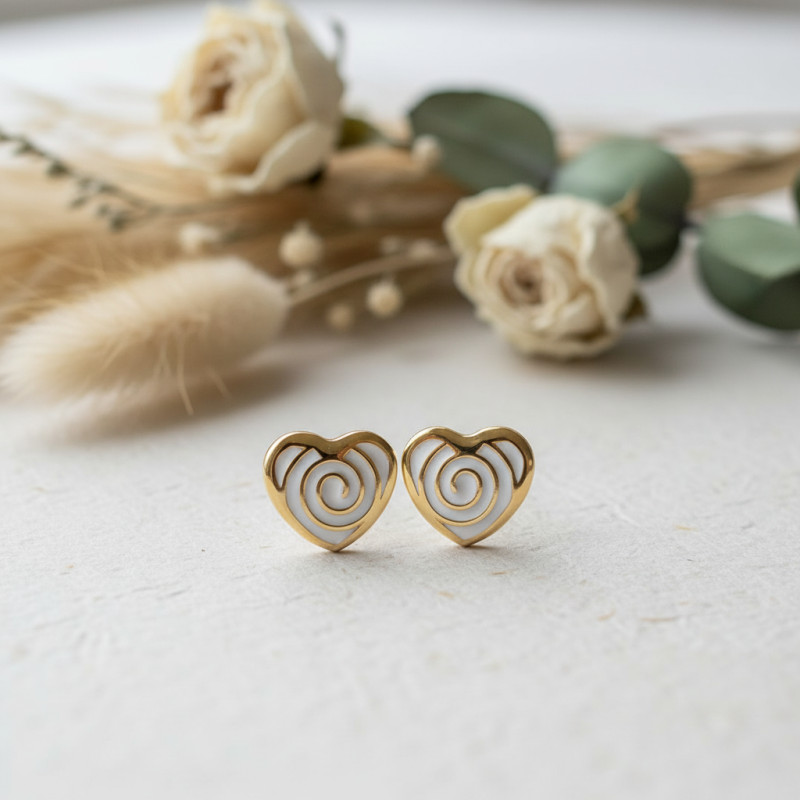 Ces superbes boucles d'oreilles pour enfant vous sont proposées par la marque Bambins. Un modèle original en forme de cœur réalisé à partir d'or jaune 375/1000 (9K) ou 750/1000 (18K). Le centre est recouvert d'émail de couleur blanche mettant en valeur le motif spirale.