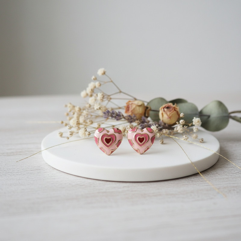 Découvrez l'élégance intemporelle de nos boucles d'oreilles en forme de cœur, conçues pour les petites filles avec un goût exquis. Plaqué or rose et laque de haute qualité se combinent pour donner vie à un chef-d'œuvre d'or et de couleur. Ces boucles pour enfants ne sont pas seulement des accessoires, mais une déclaration de mode en elles-mêmes. Un joli motif léopard est présent sur la surface des boucles.