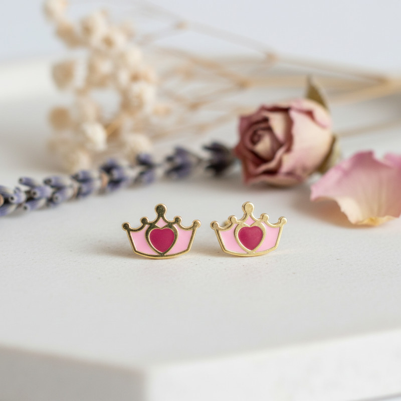 Nous vous proposons de succomber pour le charme et la mignonnerie de cette paire de boucles d'oreilles enfants ! En effet, cette paire de boucles d'oreilles est réalisée pour les petites filles, et particulièrement les petites princesses. Ces douces boucles prennent la forme de petites couronnes réalisées en émail rose ainsi qu'en or jaune. Au centre de la couronne, vous trouverez un délicat coeur réalisé dans une teinte rose également. Concernant leurs dimensions, elles sont les suivantes : 5 x 7 mm. Vous pourrez aisément les attacher aux oreilles grâce à leurs fermoirs à vis.