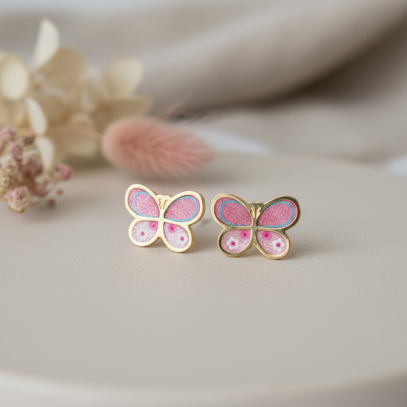 Les boucles en forme de papillon sont fabriquées à partir d'or jaune 375/1000 (9K) ou 750/1000 (18K) et recouvertes d'émaux colorés dévoilant un joli dégradé de rose. Les ailes supérieures laissent apparaître un liseré bleu tandis que sur les ailes inférieures de petites fleurs sont dessinées.