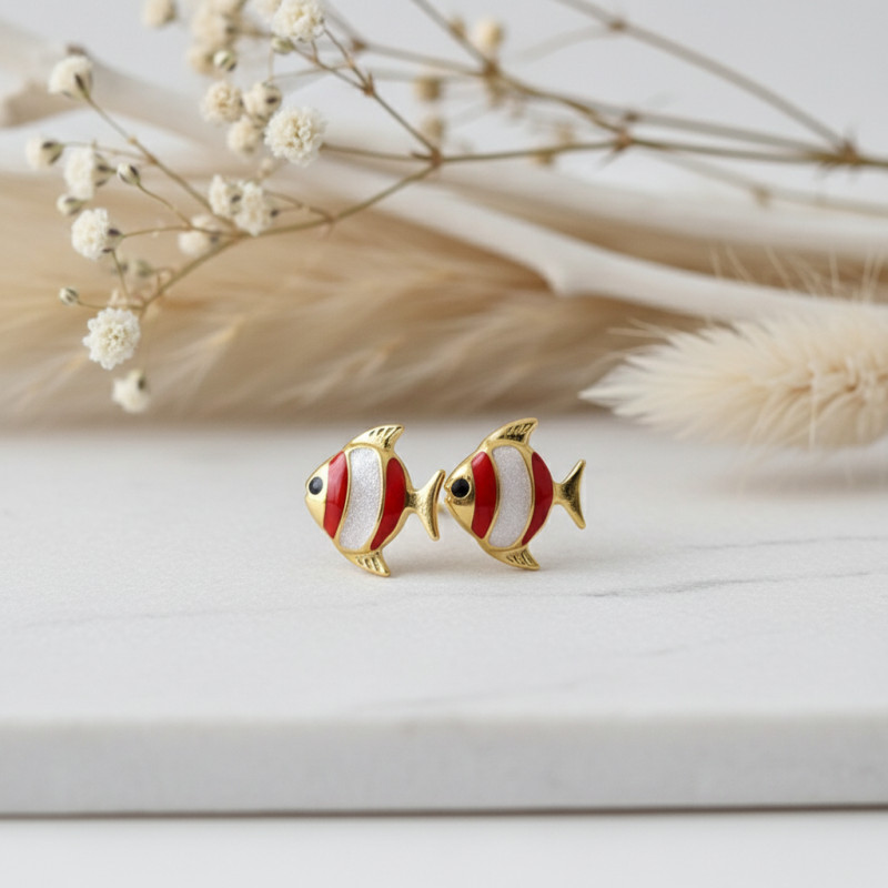 Vous pouvez découvrir ici cette belle paire de boucles d'oreilles enfant en forme de poisson. Fabriquée en or jaune 375/1000 (9K) ou 750/1000 (18K) vous avez la possibilité de choisir votre qualité d'or. Ce poisson digne des plus beaux fonds marins est de couleur rouge et blanc avec une finition laquée afin d'apporter un côté lumineux et brillant.