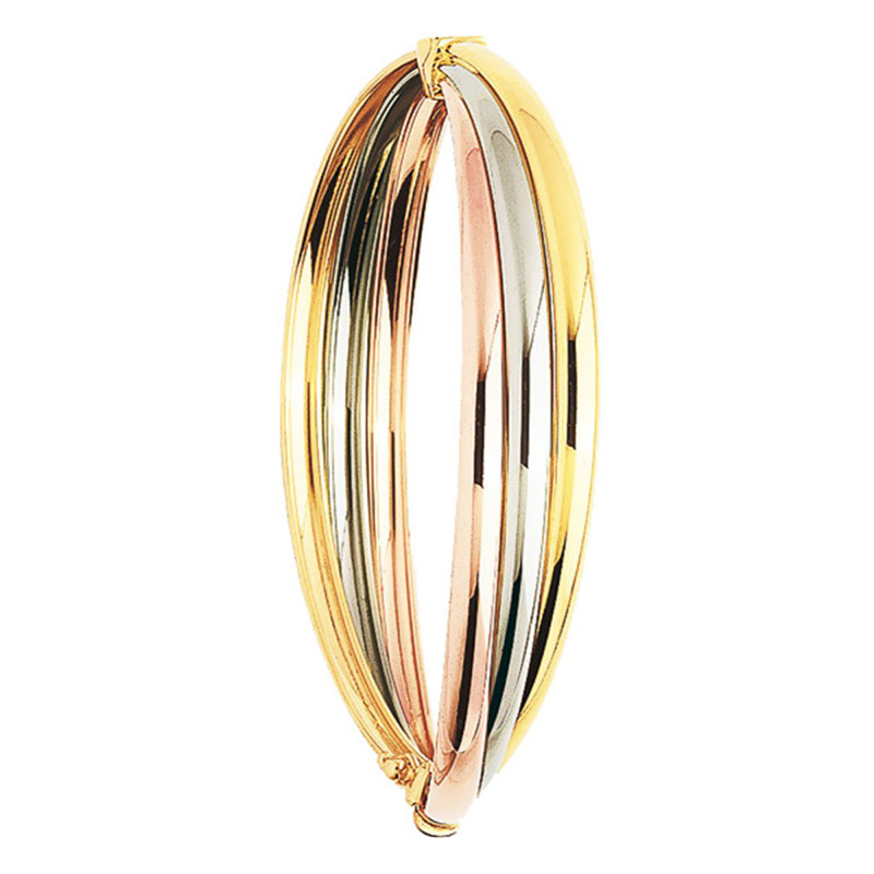 Nous sommes heureux de vous proposer notre sélection de bracelet femme qui vont vous plaire à coup sûr ! Comme ce grand classique de la bijouterie qui n'est autre que le jonc. Ce bracelet est de type demi jonc plat soudé massif réalisé en 3 ors 375/1000 (9K). Les trois ors sont l'or jaune, l'or blanc et l'or rose. Il est fabriqué avec 3 anneaux soudés de 4 mm chacun, ouvrant sur charnière et fermoir avec huit de sécurité.