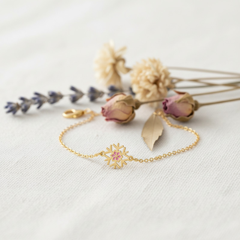 Nous avons choisi de vous proposer ce charmant bracelet qui va plaire à toutes les petites filles par sa finesse ! Ce bracelet est réalisé entièrement en or jaune 375/1000 (9K) et se compose d'une maille forçat d'une longueur de 14 cm qui s'ajuste jusqu'à 12 cm. Vous trouverez sur cette chaîne un élégant pendentif qui prend la forme d'un flocon qui est réalisé en émail avec une touche de couleur rose. Ce petite flocon plaira à coup sûr aux passionnés de ski et de neige. Vous pourrez offrir ce bijou lors d'un anniversaire ou bien d'un baptême.