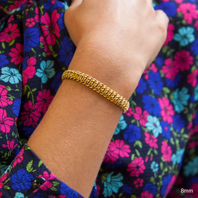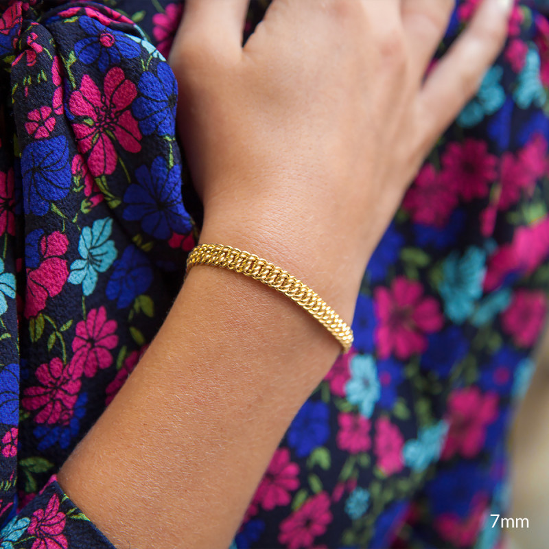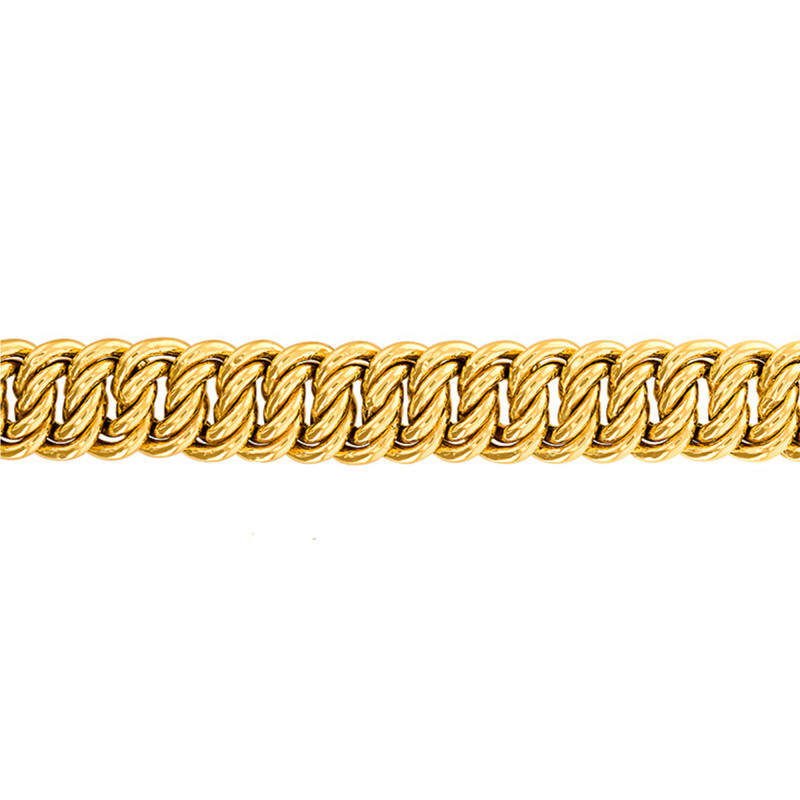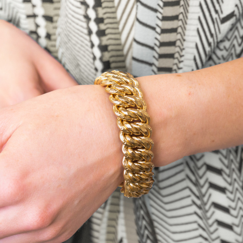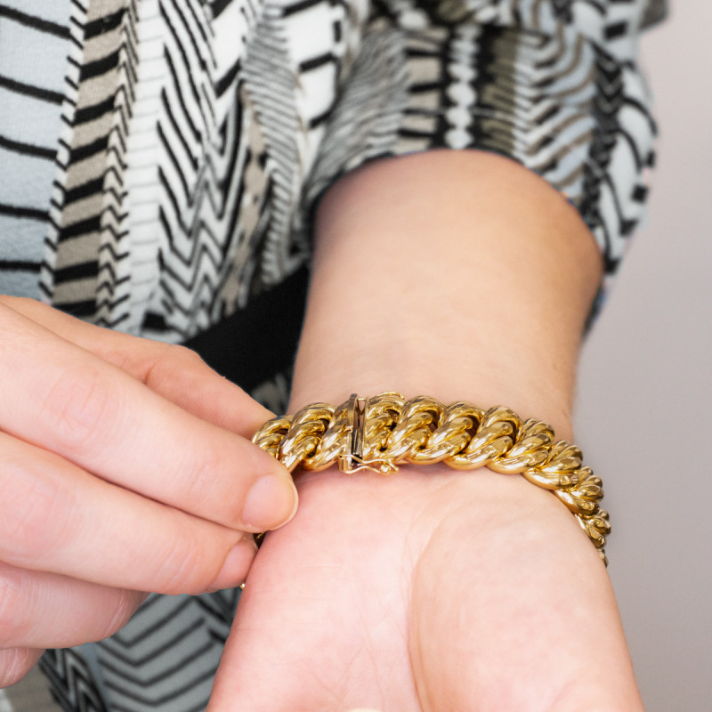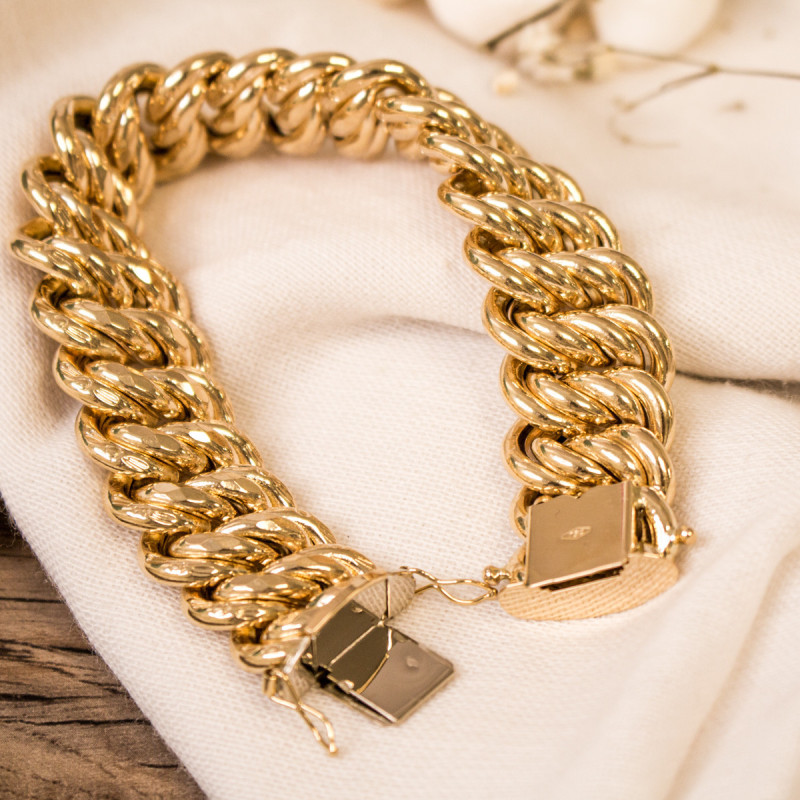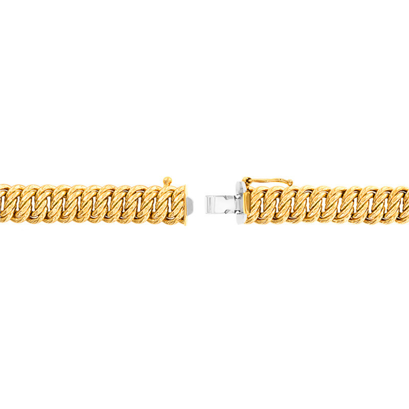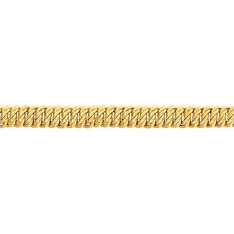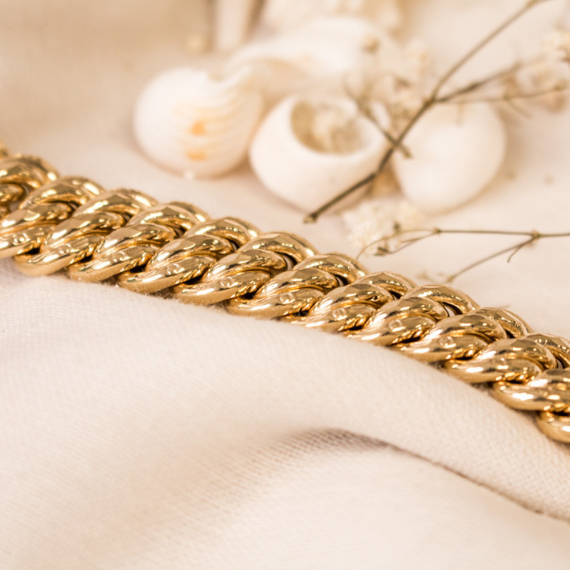 En collaboration avec la maison, nous avons choisi de vous proposer cette somptueuse chaîne. Elle est de type bracelet chaîne et est réalisée entièrement en or jaune 750/1000 (18K). Disponible dans une longueur de 21 cm, elle se compose d'une douce et raffinée maille américaine. Cette maille imposante et élégante est très appréciée par le public féminin, n'hésitez pas à l'offrir à une femme pour une occasion particulière. Sachez qu'elle est disponible dans plusieurs largeurs et que son fermoir change lui aussi en fonction de la largeur choisie.