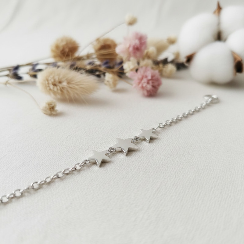 Comme ce sublime modèle que nous avons choisi de vous dévoiler ici. Ce bracelet a été réalisé entièrement en argent rhodié 925 pour qu'il garde sa couleur durant de longues années. Il a la particularité de nous dévoiler en son centre trois petits pendentifs représentant des étoiles. Ce bracelet s'accompagne d'une chaine forçat ronde.