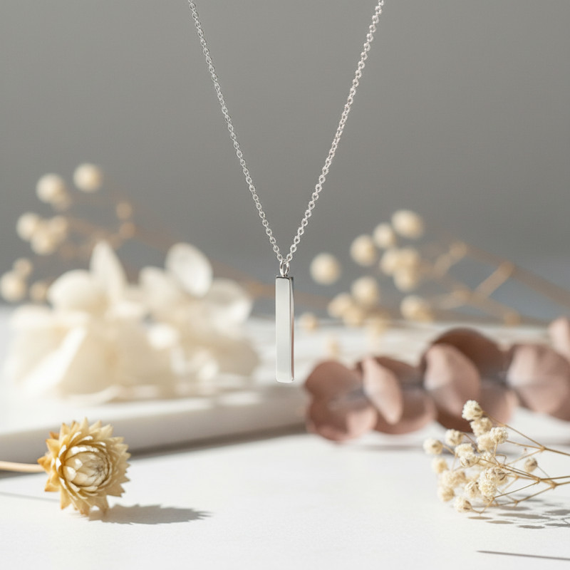 Ce pendentif rectangulaire évoque une plaque fine, synonyme de pureté et de minimalisme assumé. Grâce à cette sobriété, le collier trouve sa place sur toutes les tenues, du plus casual au plus sophistiqué, en passant par les ensembles formels.
