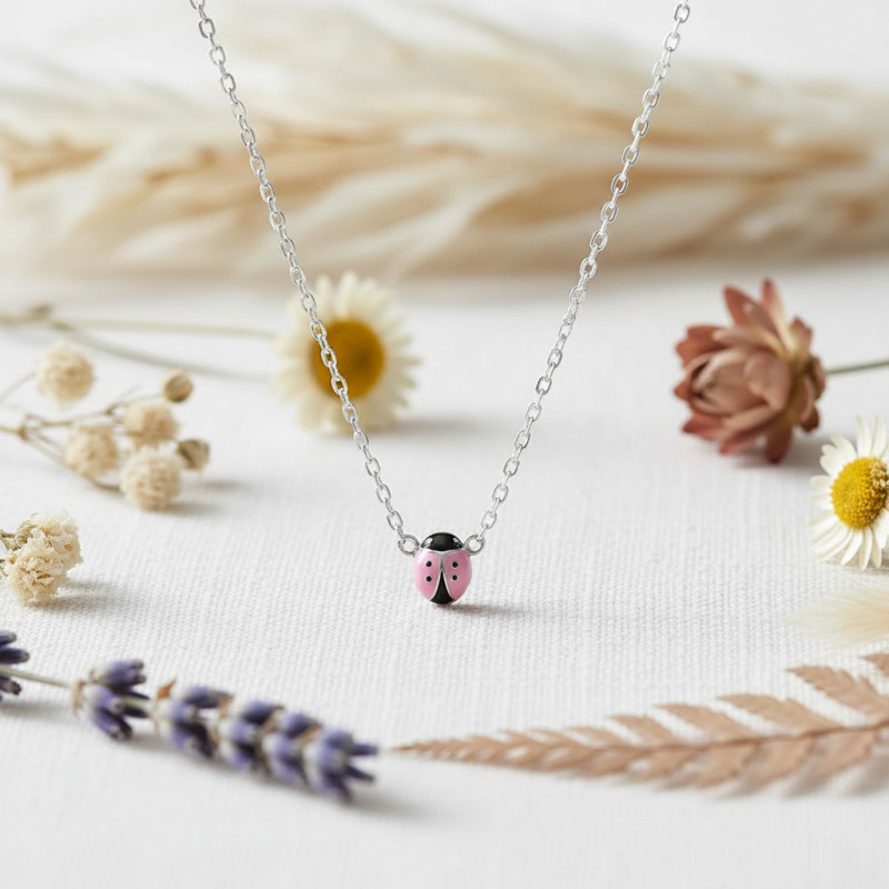 Un élégant pendentif est présent pour apporter la touche élégante et enfantine. En effet, c'est l'insecte préféré des enfants qui est présent et qui n'est autre que la coccinelle. Cette coccinelle est réalisée en laque de couleur rose et noire pour faire les petits pois. Comptez un poids d'argent de 1,65 gramme parfait pour un enfant.