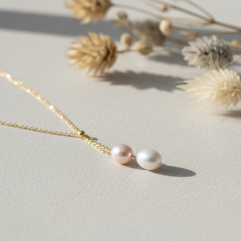 Nous sommes heureux de vous présenter ce collier femme réalisé en or jaune et en perles de culture. Il est composé d'une perle de culture blanche et une perle de culture rosée qui sont suspendues a 2,50 cm et 3 cm du centre du collier. La perliculture ayant tant progressé ces dernières années, les perles de cultures viennent aujourd'hui principalement d'Asie.