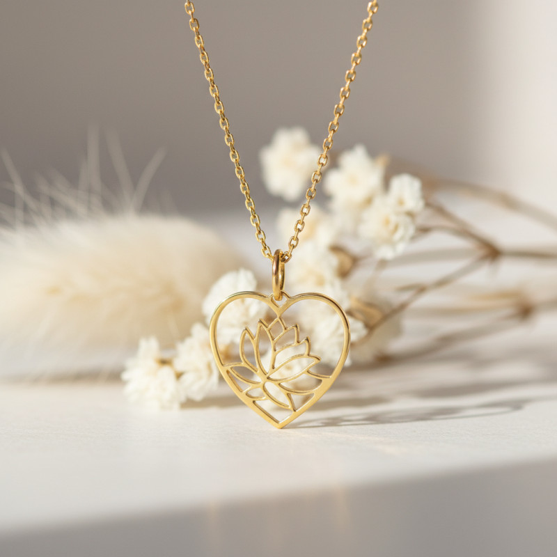 Nous sommes ravis de vous proposer ce ravissant modèle réalisé entièrement en or jaune 750/1000 (18K). Ce collier au design épuré et élégant, est doté d'une fine chaine en maille forçat, nous dévoilant un sublime pendentif ajouré en forme de cœur. Un magnifique nénuphar vient se positionner à l'intérieur de ce cœur, apportant une touche de douceur et de légèreté à ce modèle. La fleur de lotus symbolise la prospérité, la pureté du corps mais également la longévité et l'éternité. Ce collier possède donc une signification importante qui portera chance à celui qui le portera. Il conviendra parfaitement pour un cadeau d'anniversaire à une personne passionnée par la nature. La chaine de ce collier mesure 42 cm de longueur avec un anneau intermédiaire à 40 cm qui permettra un porté plus court en fonction de vos envies. Le poids du bijou est de 1,90 gramme. Votre collier viendra se fermer à l'aide d'un fermoir de type anneau à ressort, afin de garantir une sécurité optimale au bijou.
