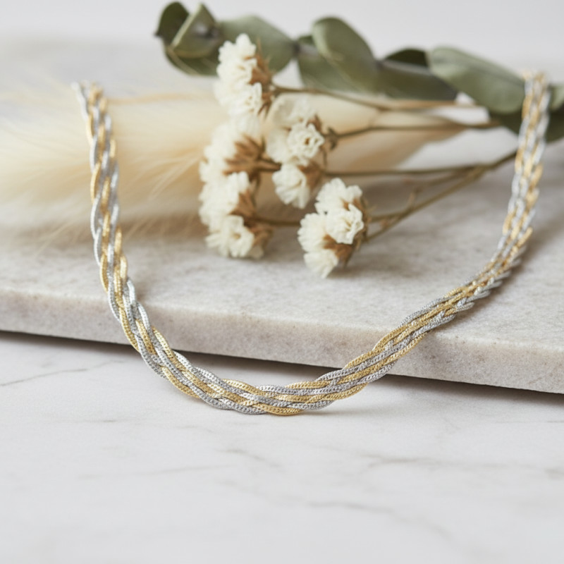 Cet agréable collier en or multi-mailles que nous avons donc choisi pour vous est le choix parfait pour un look sophistiqué et élégant soigné. Fabriqué en 2 ors 375/1000 (9K), il séduit par son aspect bicolore qui vous permettra de l'accorder avec toutes vos tenues. Il présente un design texturé avec des finitions polie et satinée qui lui confèrent un charme plus intemporel. Ce collier tressé de 5,30 mm de largeur est composé par trois mailles chevrons en or jaune et trois mailles chevrons en or blanc. Le tout en fait un bijou moderne et tendance qui vous embellira pendant des années.