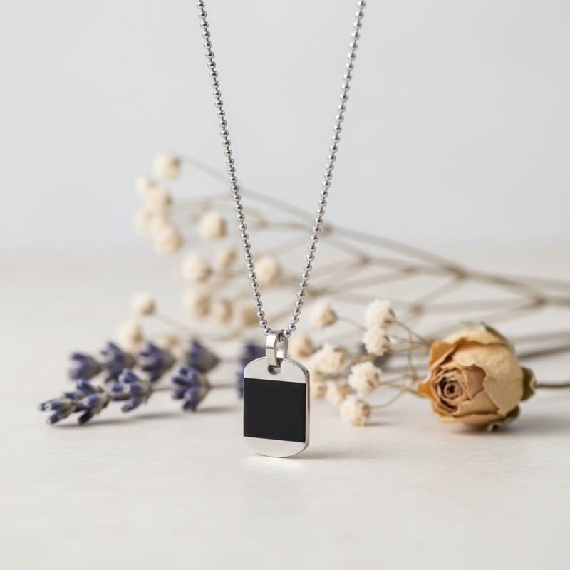 Grâce à son pendentif de style plaque militaire qui évoque force et charisme, il s'adresse à ceux qui désirent affirmer leur style audacieux et avant-gardiste. Sa dimension de 22 x 15 mm est parfaite pour se faire remarquer tout en restant élégamment discrète. Celui-ci est orné d'une sublime pierre d'agate noire.