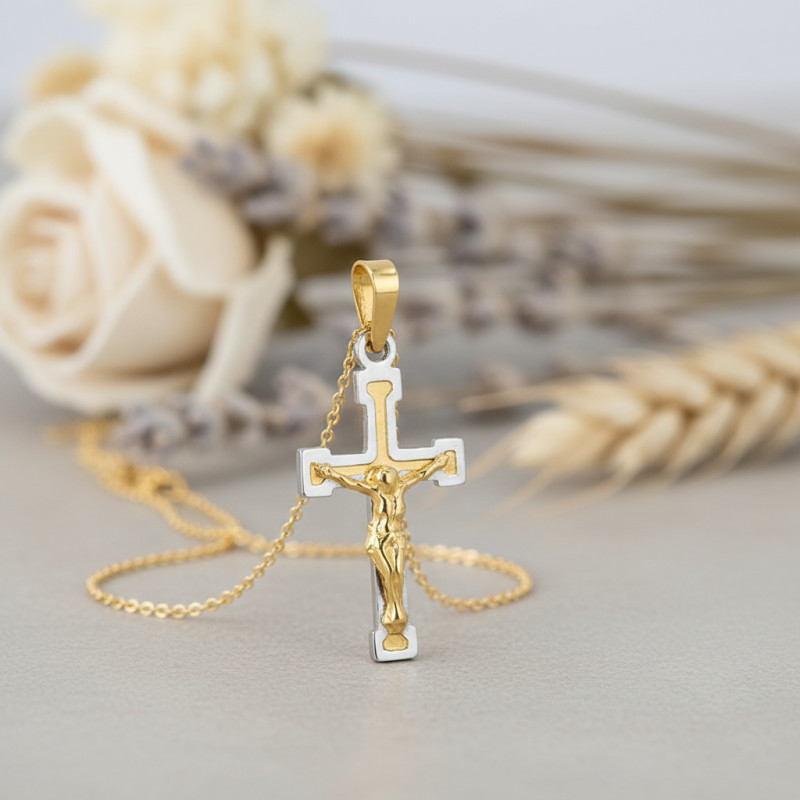 La maison Vandona vous propose d'ailleurs de craquer pour cette sompueuse croix réalisée entièrement en 2 ors, or jaune et blanc 750/1000 (18K) Cette croix nous présente un Christ réalisé en relief qui repose sur deux bâtons sur une section carrée. Les extrémités proposent un rhodiage en or blanc qui vient contraster avec l'or jaune. Concernant ses dimensions, la croix dispose d'une largeur de 12,50 mm et d'une hauteur de 21 mm. Cette sublime croix dispose d'un poids d'or moyen de 0,55 gramme, qui sublimera vos tenues lors de vos évènements religieux ou en port quotidien.