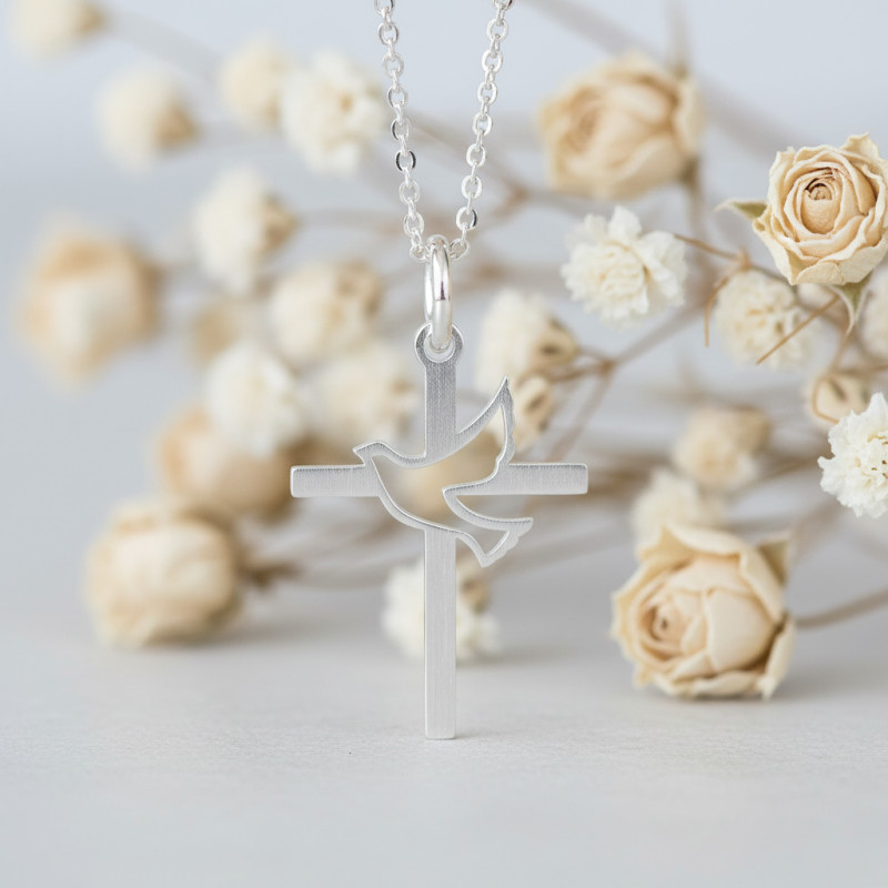 Elle vous propose cette délicate croix réalisée en or blanc. Cette croix dispose d'une hauteur de 20 mm. Elle nous dévoile en son centre une magnifique colombe au corps ajouré. Une idée de cadeau très symbolique, ces motifs symbolisant la paix.