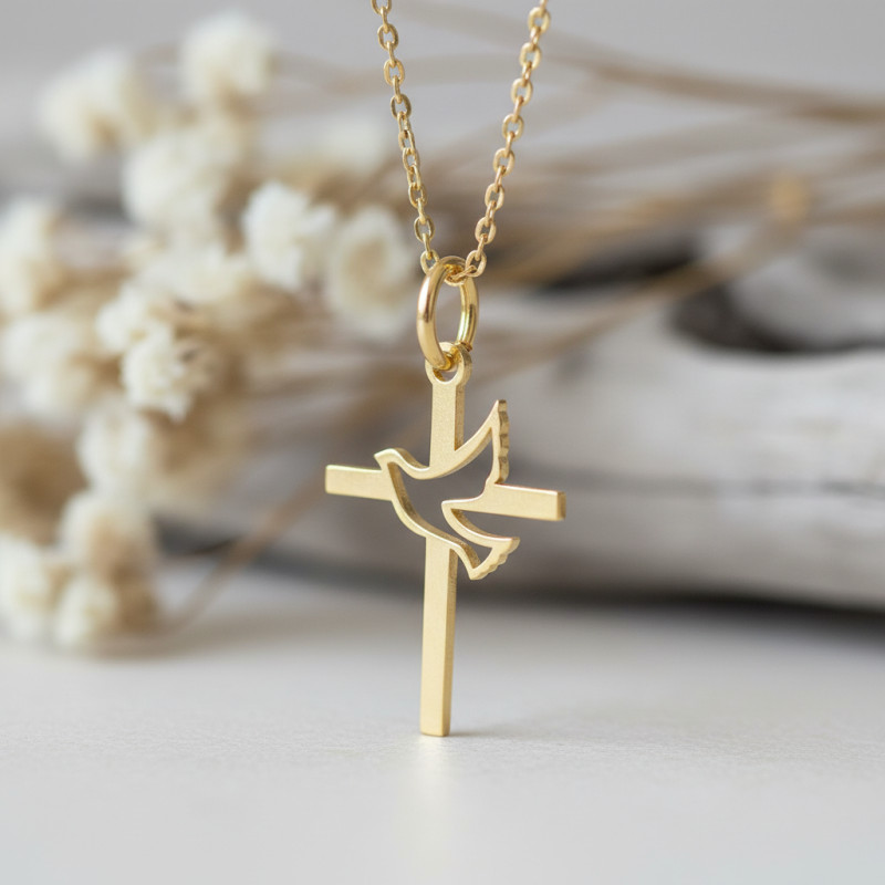 Elle vous propose cette délicate croix réalisée en or jaune. Cette croix dispose d'une hauteur de 20 mm. Elle nous dévoile en son centre une magnifique colombe au corps ajouré. Une idée de cadeau très symbolique, ces motifs symbolisant la paix.