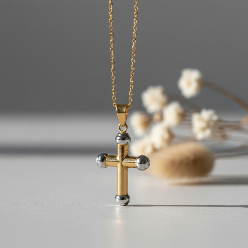 La maison espagnole Vandona a le plaisir de vous proposer cet élégante croix réalisée en 2 ors 375/1000 (9K). En or jaune et or blanc 375/1000 (9K). Elle présente un corps épais et est de type fil rond avec une boule a chaque extrémité réalisée en or blanc. Concernant ses dimensions, elles sont les suivantes : une largeur de 16 mm et une hauteur de 21,50 mm. Concernant son poids d'or moyen, il est de 1,07 gramme pour une épaisseur 3,20 mm. Ce produit ne peut pas être gravé dû son corps creux, mais il est disponible en or 750/1000 (18K) également.