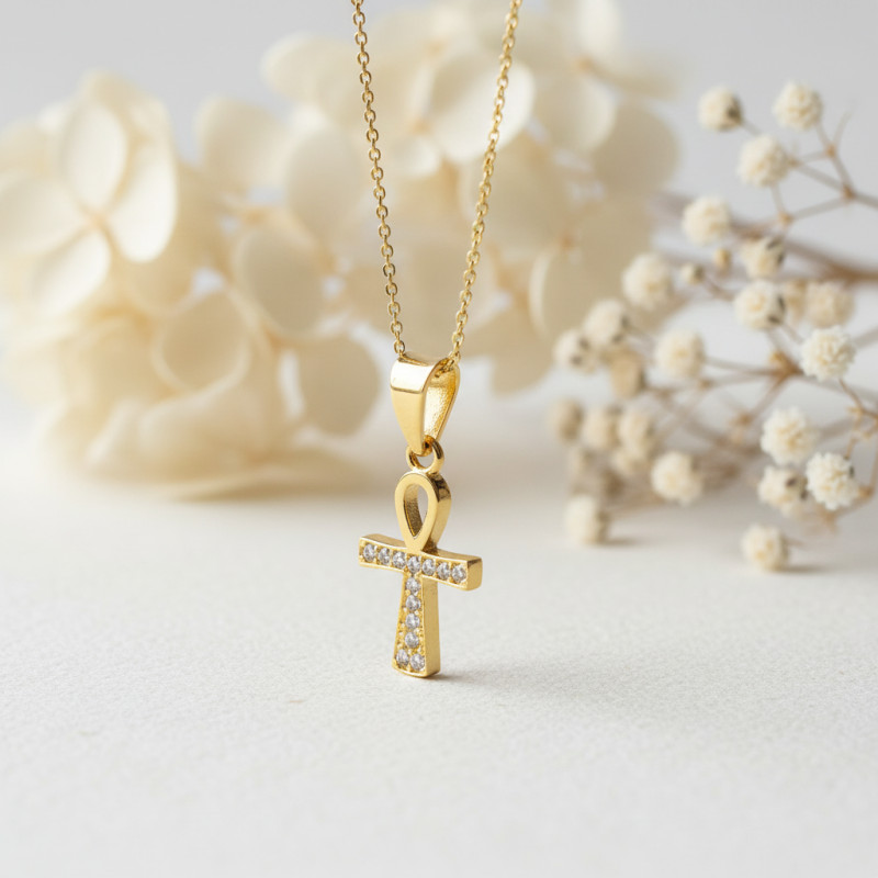 Laissez-vous émerveiller par cette sublime croix de vie égyptienne faite en or jaune 750/1000 (18K). À porter comme une amulette personnelle ou comme un ornement raffiné, elle brillera de mille feux sur votre cou grâce aux zircons blancs et ronds l'ornant. Son éclat est accentué par une finition polie qui met en valeur sa belle couleur dorée. Connue également sous les noms de croix ansée, clé de vie ou croix “Ankh”, cette croix égyptienne est un fort symbole lié à l'immortalité, à la divinité et à la sagesse.