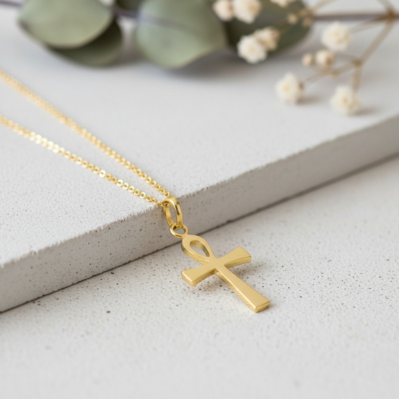 La marque Emanessence vous propose cette belle croix de vie égyptienne en or jaune poli 375/1000 (9K) ou 750/1000 (18K). Elle représente la vie éternelle et l'union harmonieuse du ciel et de la terre. Les branches de celle-ci sont évasées, la croix mesure 13 mm de largeur et 22 mm de hauteur (sans la bélière qui mesure 5 mm).