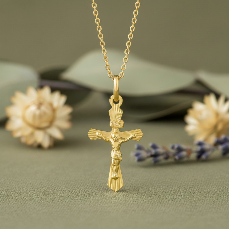 Avec Emanessence, nous avons opté pour ce magnifique pendentif en croix réalisé en or jaune 750. Idéal pour toutes les occasions, celui-ci présente un design en crucifix. Fabuleusement élaboré, ce dernier mesure 13 mm de largeur avec une hauteur de 21 mm. En effet, cette croix du Christ est un cadeau parfait à réaliser lors d'une occasion religieuse comme un baptême ou une communion par exemple.