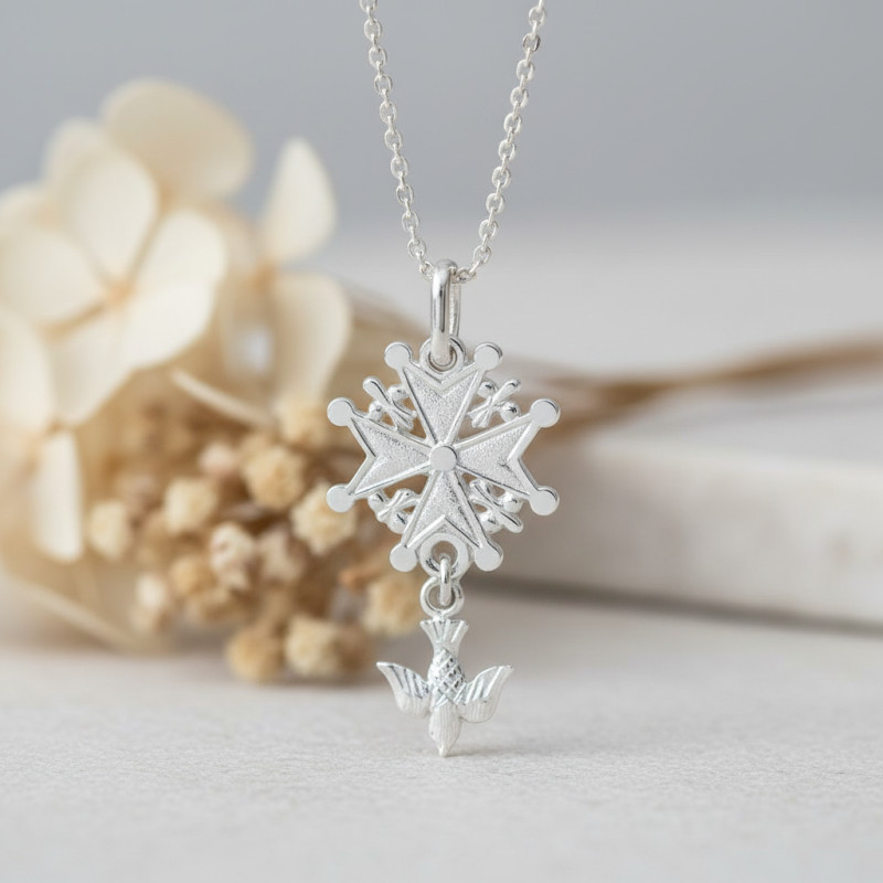 Nous avons choisi en collaboration avec la maison de vous dévoiler cette jolie croix huguenote. Elle est réalisée entièrement en or blanc 750/1000 (18K) pour garder son éclat durant des années. Cette croix est aussi appelée croix protestante puisqu'elle est l'emblème du mouvement religieux protestant. Son design facilement reconnaissable est inspiré de la croix de Malte, et la colombe représente le Saint Esprit.