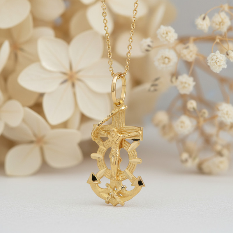 Nous vous proposons ce charmant pendentif croix, réalisé en or jaune 750/1000 (18K). Ce modèle original dévoile une croix se terminant en forme d'ancre marine. Au milieu, on peut apercevoir un gouvernail de bateau reliant ces deux parties. Tout cela forme un crucifix où l'on peut voir le corps de Jésus-Christ dans la posture de la crucifixion. L'ancre est symbole d'aventure et de voyage et peut avoir plusieurs significations comme la persévérance, la sécurité, la confiance et même la foi. La présence de Jésus sur la croix renforce davantage cet aspect spirituel. Ce pendentif mesure 15 mm de largeur et 30 mm de hauteur. Son poids d'or moyen est de 2,70 grammes.