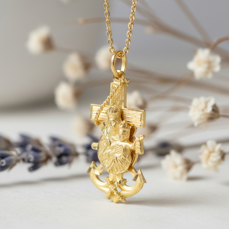 Nous vous proposons de craquer pour ce ravissant pendentif croix, réalisé en or jaune 750/1000 (18K). Ce modèle est une croix revisitant les différents symboles marins. Elle combine l'ancre marine et le gouvernail d'un bateau et dévoile en son centre la Vierge du Carmen, tenant dans ses bras l'enfant Jésus. Sainte patronne des pécheurs et des marins, elle est pour eux un véritable porte-bonheur et chaque 16 juillet, elle honore tous ceux qui ont perdu la vie en mer. Ce pendentif peut donc être le cadeau parfait pour tous les pécheurs ou les passionnés du monde marin. En ce qui concerne les dimensions de cette croix, elle mesure 19 mm de largeur pour 35 mm de hauteur. Son poids d'or est d'environ 3,75 grammes.