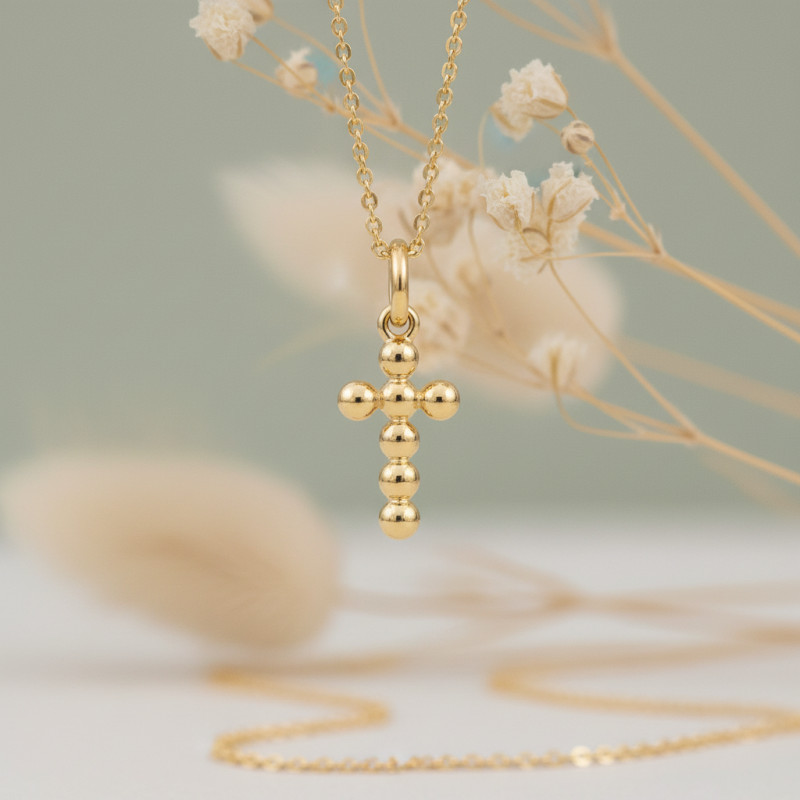 Emanessence vous présente cette très belle croix atypique en or jaune 750/1000 (18K) (750/1000). Elle est disponible en deux tailles afin de s'adapter au mieux au cou de son destinataire. Composée de petites boules en or le petit modèle est composé de 7 billes, tandis que le grand modèle en possède 12.