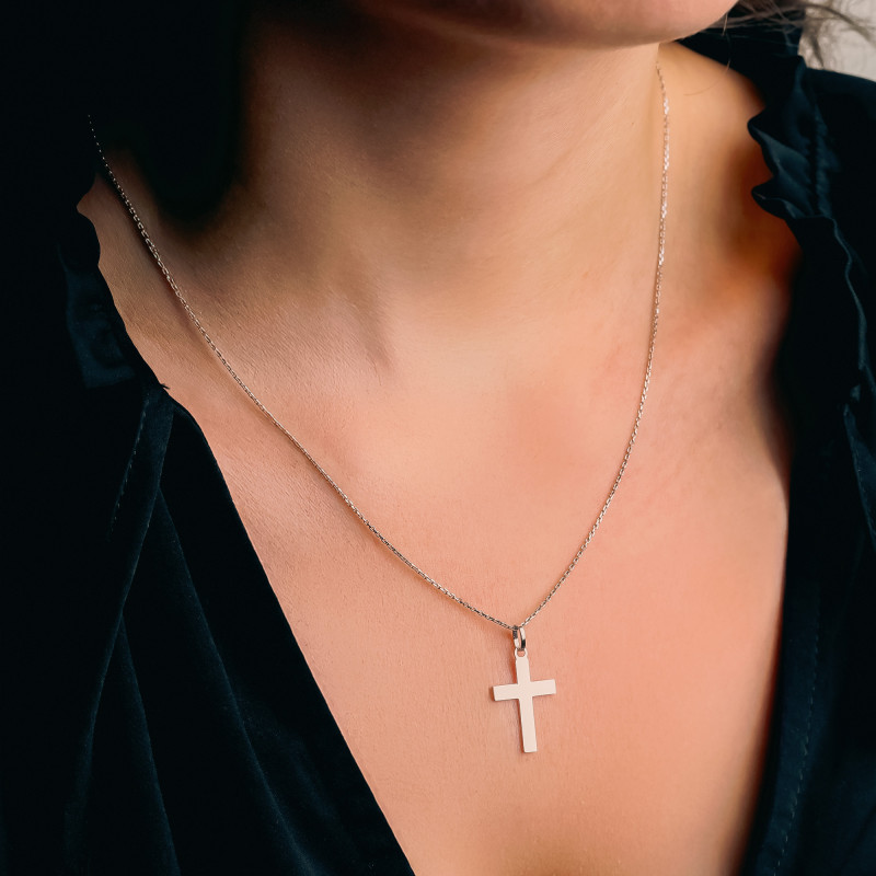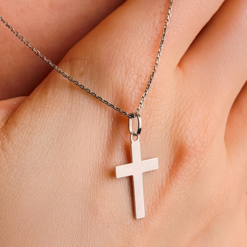Cette croix latine fabriquée par Emanessence est en or blanc. Elle est composée de bâtons plats d'une largeur de 3 mm qui lui permettent de convenir à un homme ou une femme. Elle mesure 18 mm de hauteur sans la bélière (23 mm avec la bélière). La largeur de la barre horizontale est de 11 mm.