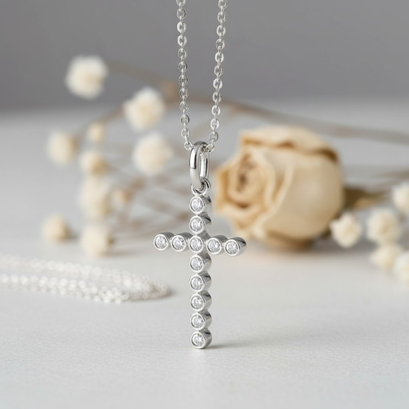 Cette croix chrétienne est fabriquée à partir d'or blanc 750/1000 (750/1000 (18K)) et a été imaginé avec une largeur de 10 mm pour une hauteur de 16 mm (21 mm si on prend en compte la bélière) et avec un poids moyen de 0,70 gramme. Au total, la croix est composée de 12 oxydes de zirconium, des pierres qui lui apportent beaucoup d'élégance et de luminosité.