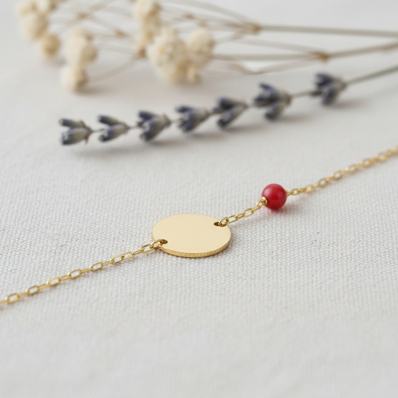 Nous vous proposons ce ravissant modèle réalisé en or jaune 750/1000 (18K). Cette gourmette se pare d'une fine chaine en maille forçat et d'une magnifique plaque de forme ronde. C'est un modèle personnalisable, vous pourrez ainsi faire graver l'inscription de votre choix. Ce sublime bijou arbore également sur sa chaine une superbe cornaline. Cette pierre naturelle semi-transparente appartient à la famille des agates. Elle est dotée d'une magnifique couleur rouge orangée et symbolise la joie de vivre, le charisme et la confiance en soie. C'est une pierre qui apporte du courage et de l'assurance. Cette gourmette fera donc un très beau cadeau de naissance, d'anniversaire ou de cérémonie religieuse. Elle portera chance à la personne qui la portera. En ce qui concerne ses dimensions, la chaine est ajustable et mesure entre 12 et 14 cm de longueur. Elle possède un poids d'or de 1,40 gramme. Enfin, elle viendra se fermer grâce à un fermoir sécurisé de type anneau à ressort.