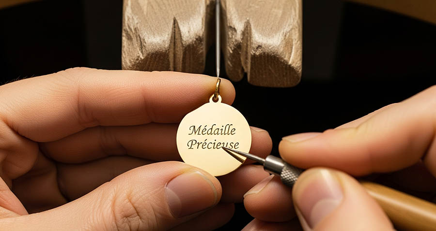La gravure mécanique, réalisée à l'aide d'un outil rotatif, creuse le métal et laisse un trait profond et durable. La gravure laser est plus précise pour les petits caractères et les détails fins, mais moins profonde. Les deux techniques donnent de beaux résultats sur une médaille en or ou en argent.