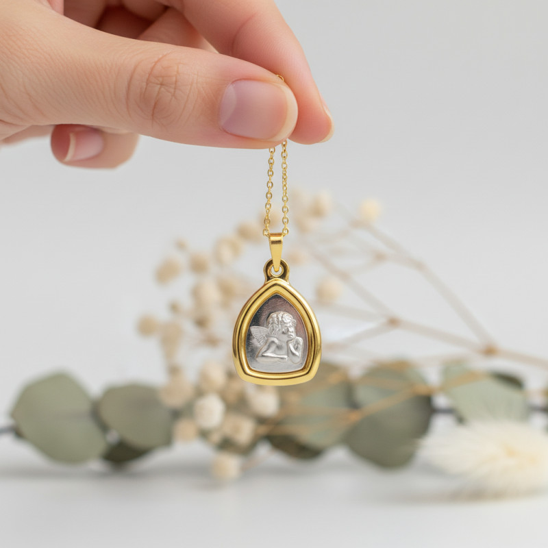 Cette magnifique médaille Ange triangulaire joue la carte de l'originalité et du raffinement. Fabriquée en or jaune et blanc 750/1000 (18K), elle séduit par sa forme et son aspect bicolore. Brillante de mille feux grâce à sa finition polie, elle est embellie par une représentation de l'ange Raphaël avec les ailes déployés et l'air pensif. Ce bijou est l'expression parfaite d'une protection divine et d'un amour éternel. Il viendra sublimer vos tenues à chacune de vos apparitions.