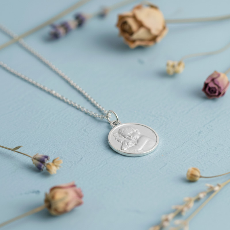 Nous vous proposons donc de craquer pour cette ravissante médaille ronde, réalisée entièrement en argent massif 925/1000. Cet attendrissant modèle vous dévoile un ange portant dans ses bras un petit agneau. L'ange correspond au messager entre la Terre et le Ciel tandis que l'agneau symbolise le christ. Cette médaille sera donc le cadeau parfait à offrir lors d'une cérémonie religieuse comme le baptême ou la communion. De plus, Médaille Précieuse vous propose de personnaliser le verso de votre bijou grâce à une gravure. Vous pourrez ainsi y inscrire une date ou un prénom afin de rendre ce pendentif encore plus personnel et unique.
