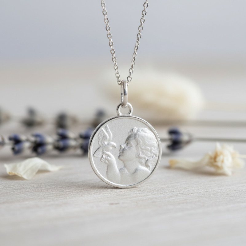 Cette charmante médaille Ange ronde vous accordera une belle allure. Elle est fabriquée en argent 925 avec une finition grainée lui accordant cet effet sablé. Elle affiche 15 mm de diamètre avec 0,50 mm d'épaisseur, ce qui vous accordera un port agréable. Simple et raffinée, elle est sublimée par un motif central arborant un ange en compagnie d'une colombe sur son index. Cet être céleste aux cheveux bouclés apporte une touche captivante à caractère religieux à ce pendentif.
