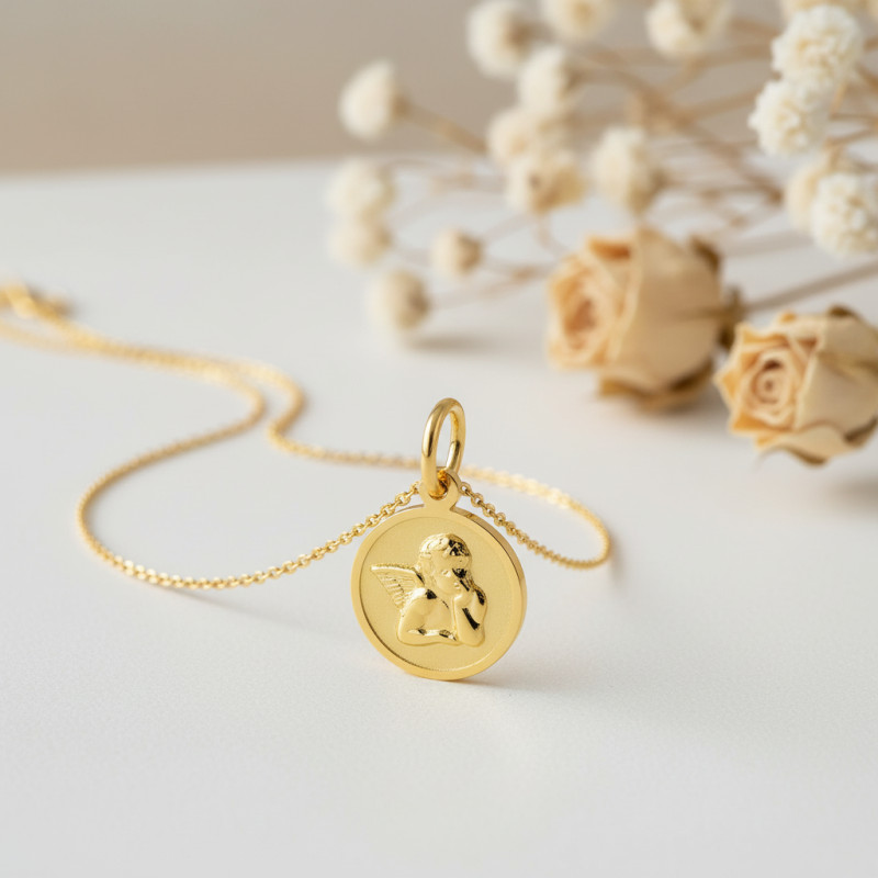 Ce modèle est pourvu d'une bélière de 6,60 mm de longueur au travers de laquelle vous pourrez faire passer la chaîne de votre choix. Nous vous recommandons les chaînes dorées de notre site internet pour une uniformité parfaite. Il est préférable de choisir celle dont le poids est supérieur à celui de la médaille pour éviter la casse.