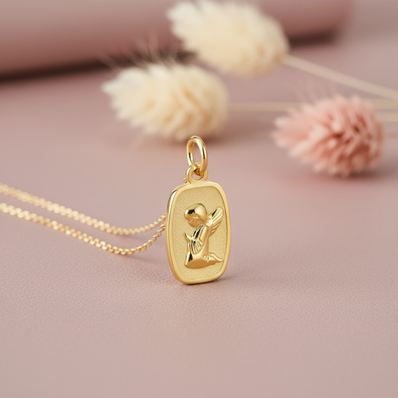 Cette agréable médaille ange en prière est un bijou raffiné et religieux qui soulignera subtilement votre look et vous ajoutera une touche de douceur intemporelle. Elle est proposée en or jaune 375/1000 (9K) et en or jaune 750/1000 (18K) et arbore une noble finition polie sur ses bords qui vous offrira un éclat somptueux. Belle à regarder, elle présente une forme rectangulaire mesurant 10 mm de largeur et 15 mm de hauteur. Le centre affiche un aspect sablé et comporte une belle gravure en relief d'un ange en prière, vue de profil, agenouillé avec les mains jointes et les yeux abaissés.