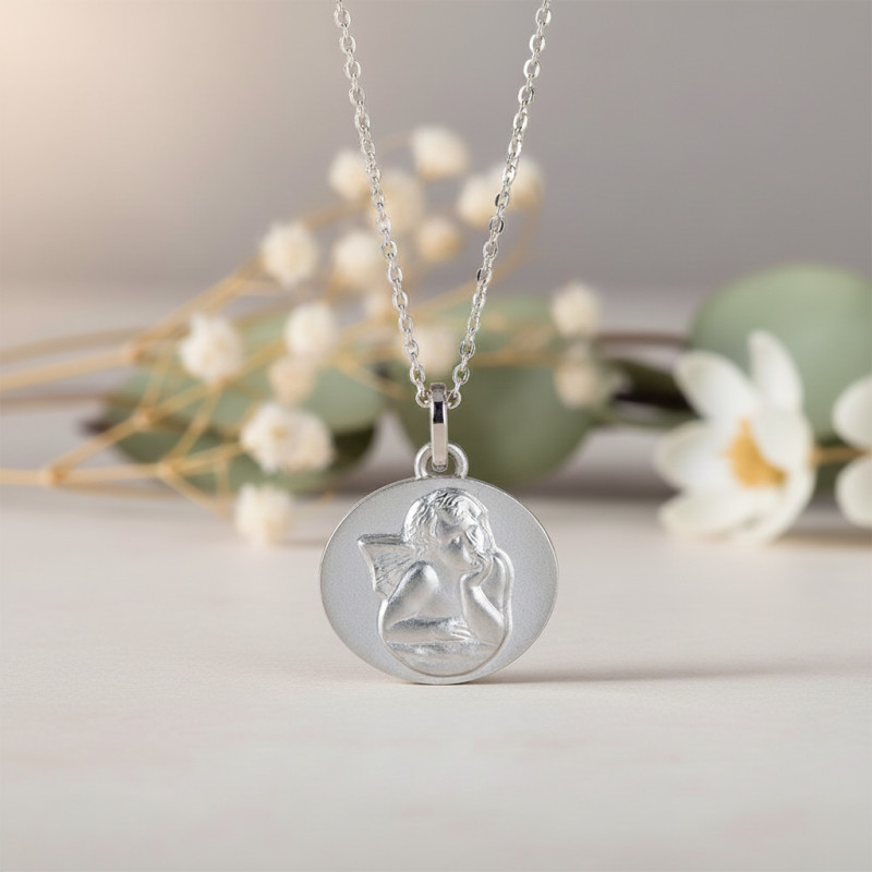 Nous vous proposons de craquer pour cette ravissante médaille de forme ovale, réalisée entièrement en argent massif rhodié, de qualité 925/1000. Elle dévoile en son centre un adorable petit ange gardien, qui saura protéger la personne qui le portera. En effet, ce bijou sera le cadeau idéal pour une cérémonie religieuse ou pour toute autre occasion. En ce qui concerne ses dimensions, ce modèle mesure 15 mm de diamètre et possède un poids d'argent de 1,15 gramme. De part sa taille et son poids, c'est un bijou qui conviendra aussi bien à la morphologie d'un enfant que d'un adulte. Vous pouvez également découvrir notre gamme de chaines en argent afin d'assortir votre pendentif en collier. Pensez en revanche à choisir un modèle plus lourd que la médaille afin d'éviter tout risque de casse.