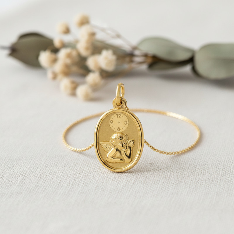 Nous vous suggérons cette magnifique médaille ange & horloge de couleur dorée. Faite en or jaune 750/1000 (18K), elle dispose d'un poids moyen de 0,75 gramme. Son pourtour poli lui apporte de la brillance tout en attirant l'attention. Ce bijou peut être personnalisé avec votre prénom ou une date de naissance au verso et l'heure de naissance sur le recto. L'ange accoudé qui est présenté sur ce dernier regarde vers le ciel tandis qu'une horloge prend place au-dessus de sa tête.