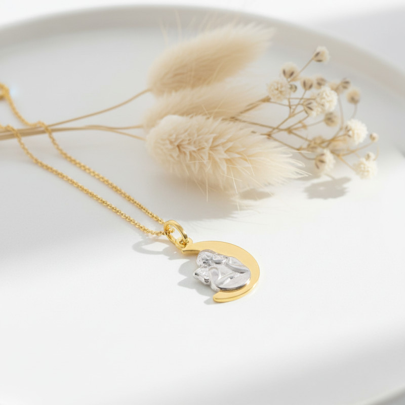 Découvrez cette charmante médaille de baptême en 2 ors 750/1000 (18K) au style polyvalent. Celle-ci rehaussera votre style avec une touche de modernité en veillant sur vous tout au long du port. Ce bijou raffiné et plein de sens se présente avec un ange fait en or blanc. Ce dernier est accoudé sur un croissant de lune réalisé quant à lui en or jaune pour un jeu de contraste saisissant.