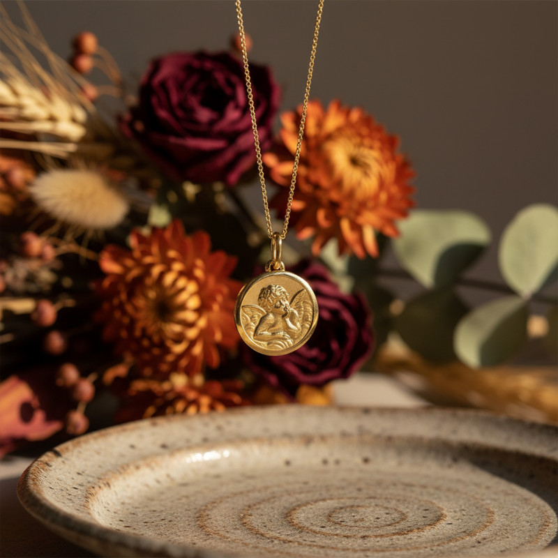 Inspirée du tableau de Raphaël, cette médaille de baptême a pour motif l'Ange Raphaël. Il est au centre du bijou, représenté sur un nuage, la tête inclinée vers le ciel et l'air pensif. Ce bijou est fabriqué en France et a une très bonne qualité de finition. De nombreux détails comme le dessin des ailes viennent lui donner beaucoup de caractère.