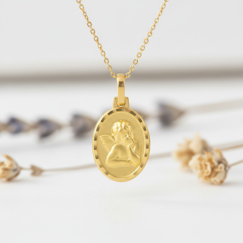 Cette ravissante médaille baptême ange ovale vous ira à ravir. Elle est façonnée en or jaune 750/1000 (18K), ce qui lui confère cette couleur dorée qui ne passe pas inaperçue. Elle affiche 18 mm de hauteur et est facettée en bordure ce qui ramène l'attention sur sa finition sablée à l'intérieur. D'un poids d'or moyen de 1,03 gramme, elle présente un joli motif de l'ange Raphaël pensif dans une posture accoudée avec le regard vers le ciel. Cette magnifique représentation apporte au bijou un caractère religieux, faisant de lui un cadeau parfait pour une occasion spéciale.