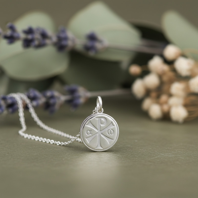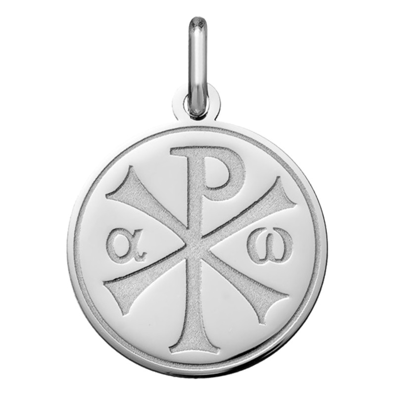 Argyor, maître médailleur depuis 1954, vous dévoile sa ravissante médaille du Chrisme. Un très joli bijou qui fait référence à Jésus Christ et qui immortalisera une naissance ou un baptême. Cette médaille aussi connue sous le nom de monogramme du Christ est réalisée en or blanc 750/1000 (18K). Ce bijou a un diamètre de 18 mm et un poids d'or moyen de 1,85 gramme. Le symbole du Chrisme a une finition sablée (mate) alors que le reste de la médaille est légèrement brillant (finition polie).