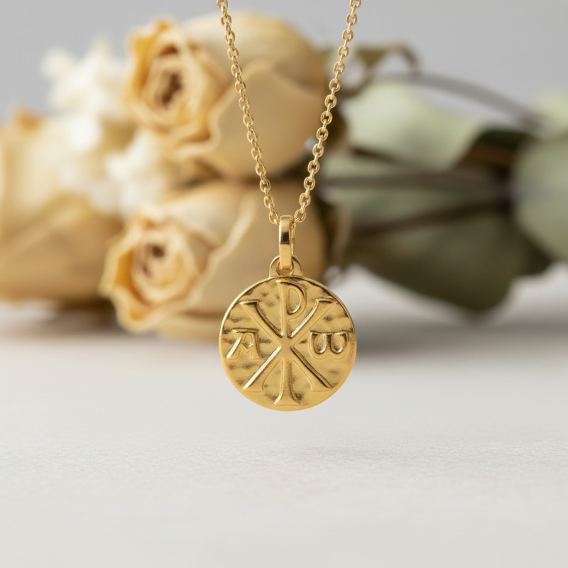 La médaille Chrisme porte le symbole du Christ, représenté par les lettres grecques XP (Chi et Rho), premières lettres du mot "Christ" en grec. Signe de foi et de victoire spirituelle, elle rappelle la présence du Christ et son triomphe sur la mort. Portée par les premiers chrétiens, elle symbolise la protection divine et l'engagement à suivre les enseignements du Christ.