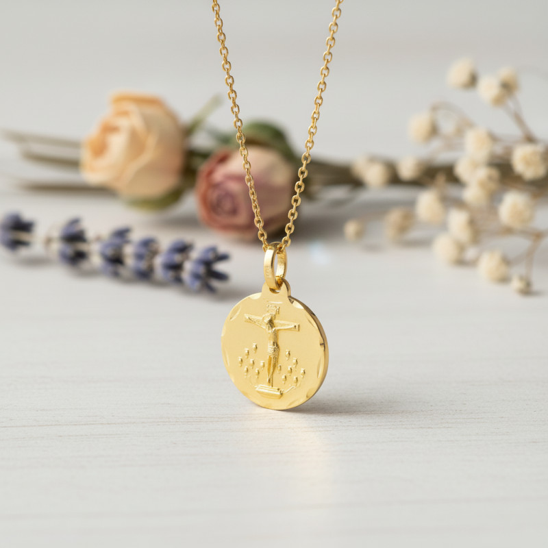Cette médaille de baptême dispose d'une jolie bélière ronde et est disponible diamètres 16 mm, 18 mm et 20 mm à choisir selon vos envies. De même, le bijou est proposé avec plusieurs grammages selon sa taille, à savoir, 1,33 gramme, 1,85 gramme, 2,25 grammes et 2,75 grammes.